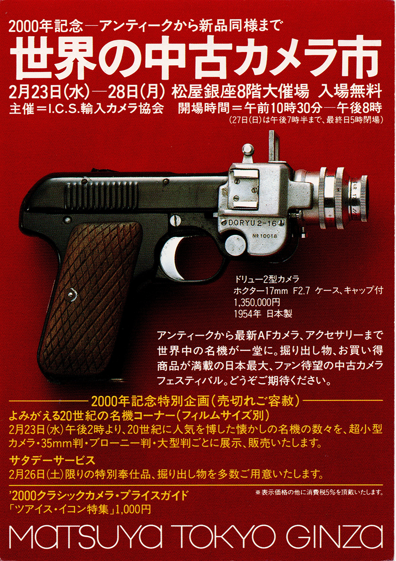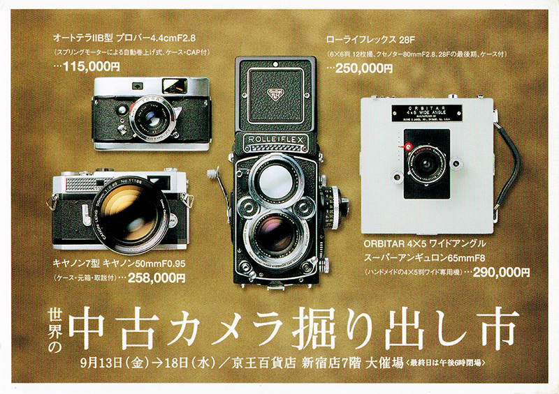 ![]() 第17回 世界の中古カメラ市 3月1日-3月6日 松屋銀座 ![]() 中古カメラ掘り出し市(14) 9月3日-12日 新宿伊勢丹 |
